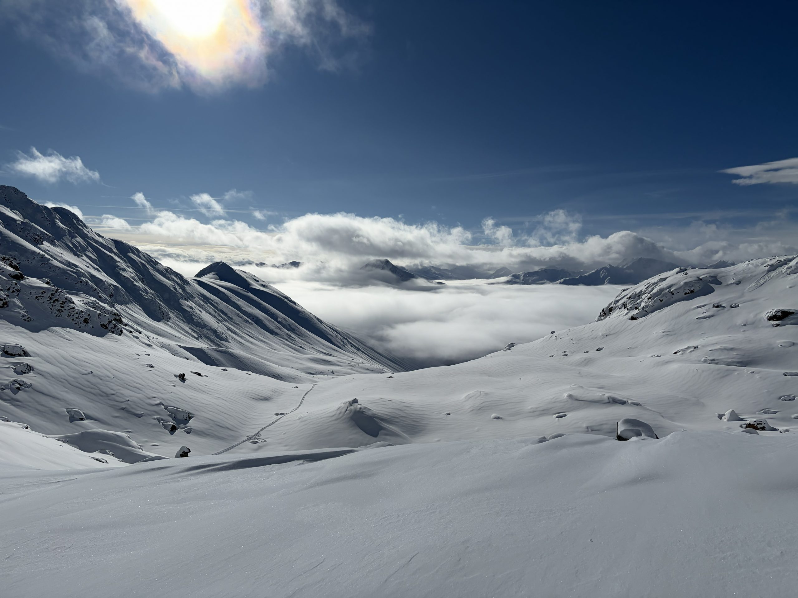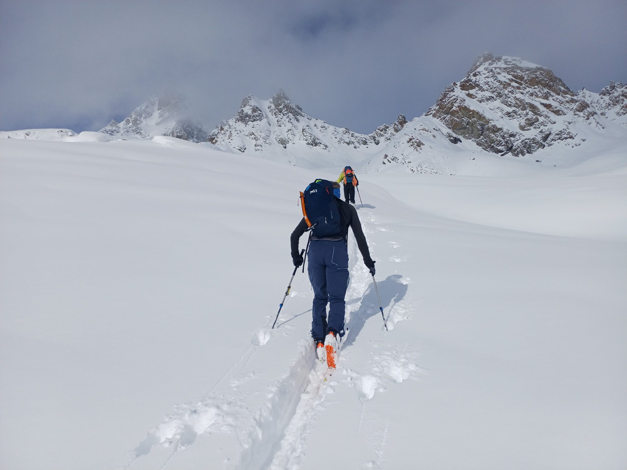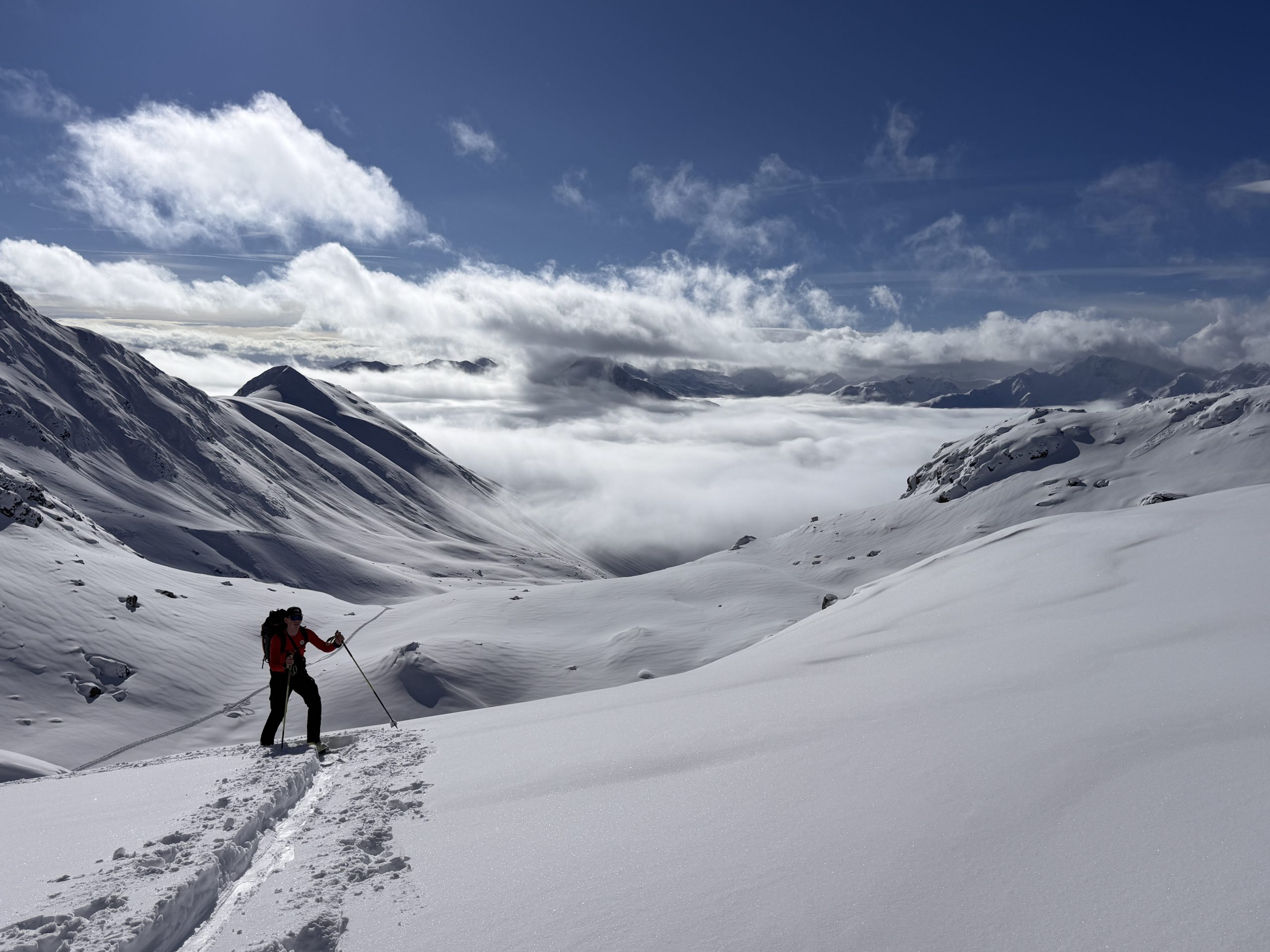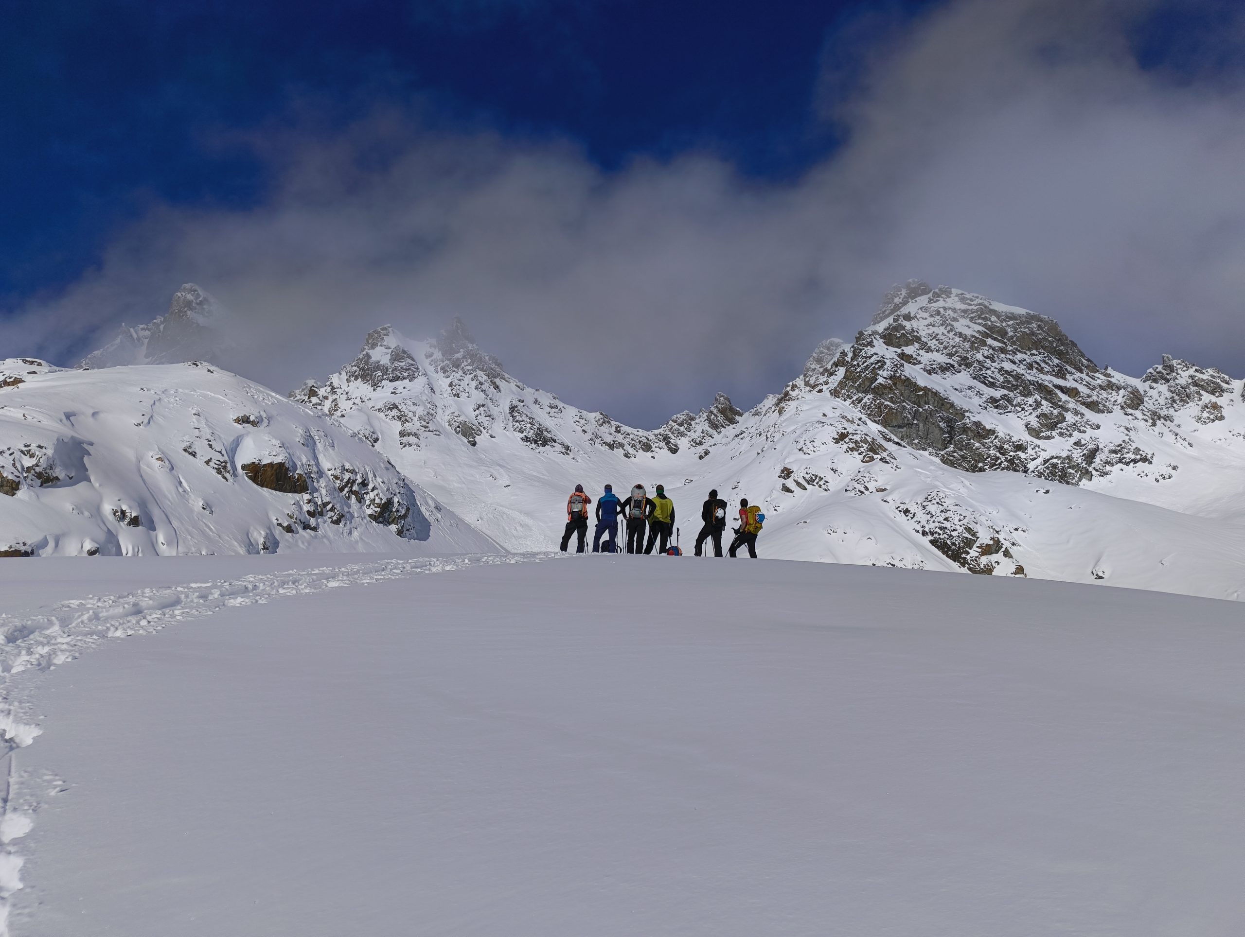 Am nächsten Tag sahen wir die Sonne und auch zum ersten Mal das tolle Bergpanorama. Nach einem gemütlichen Frühstück brachen wir Richtung Porta d’Es-cha auf. Der anhaltende Schneefall über Nacht hatte mindestens 40 cm Neuschnee gebracht. Die Lawinensituation war nicht außer Acht zu lassen, weshalb wir unseren Anstieg zur Porta über etwas lieblicheres Gelände anpassten. Vor dem steilen Anstieg zur Porta machten wir uns noch einmal einen gemeinsamen Überblick über diesen steilen Hang der sich vor uns aufbäumte und kamen alle zu dem Entschluss, dass dieser Anstieg heute leider nicht zu machen ist. Wir genossen noch ein wenig das tolle Panorama und richteten uns dann für den Abstieg her. Es wartete noch eine tolle Abfahrt mit Pulverschnee auf uns.
