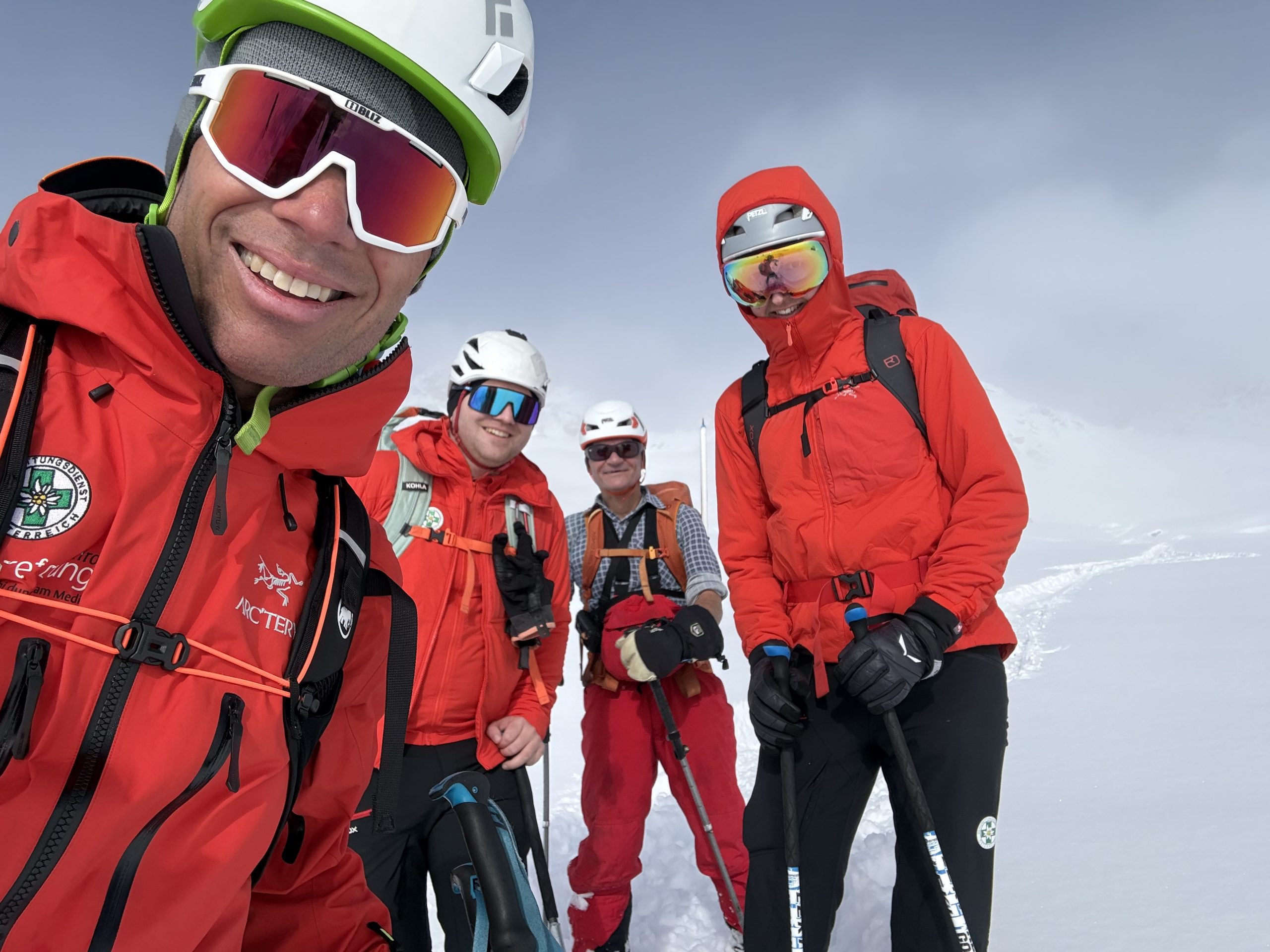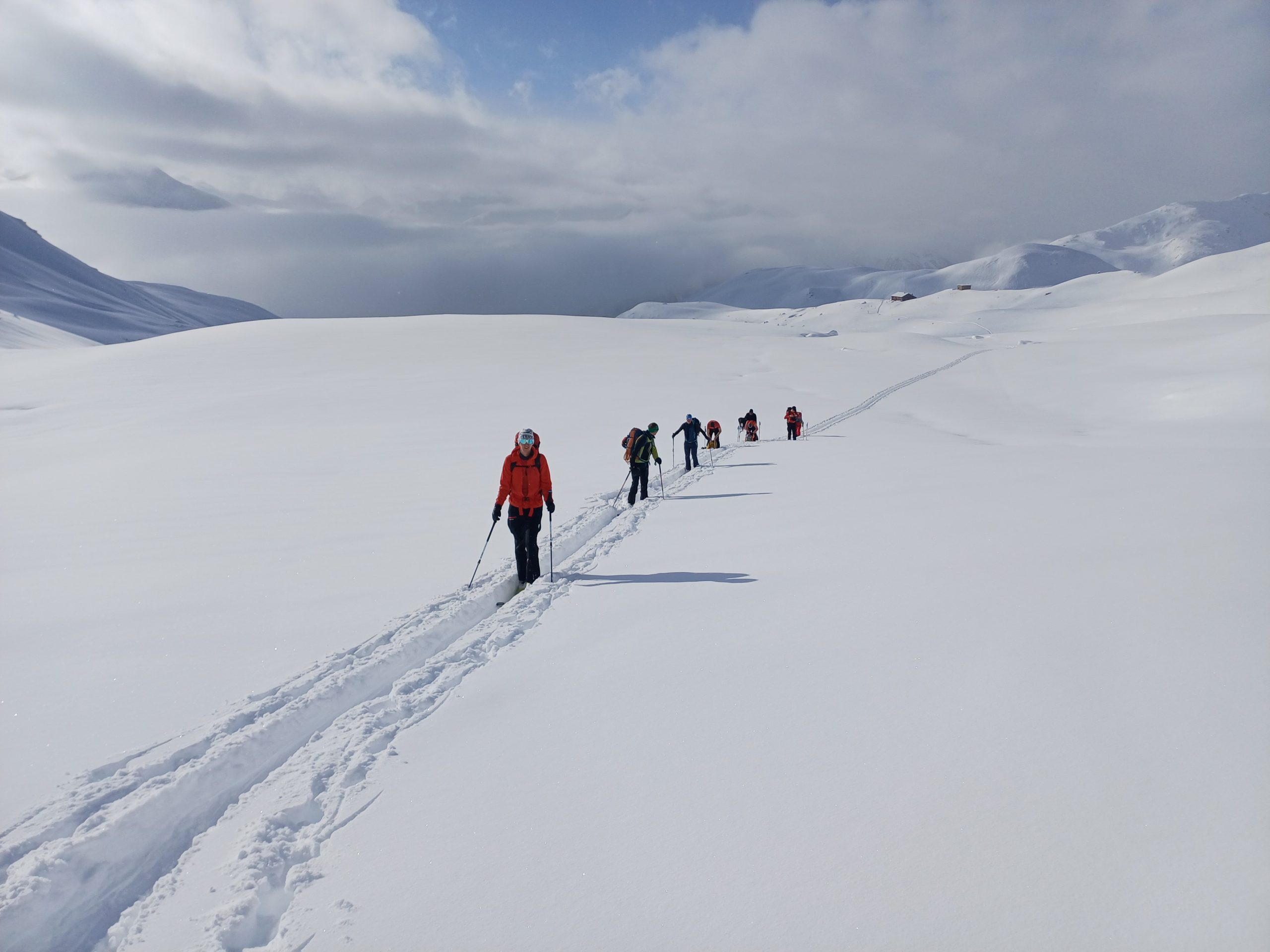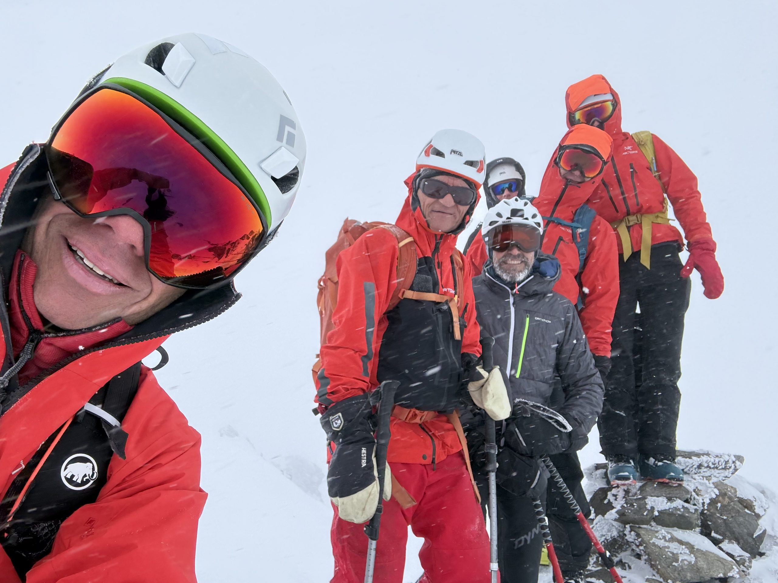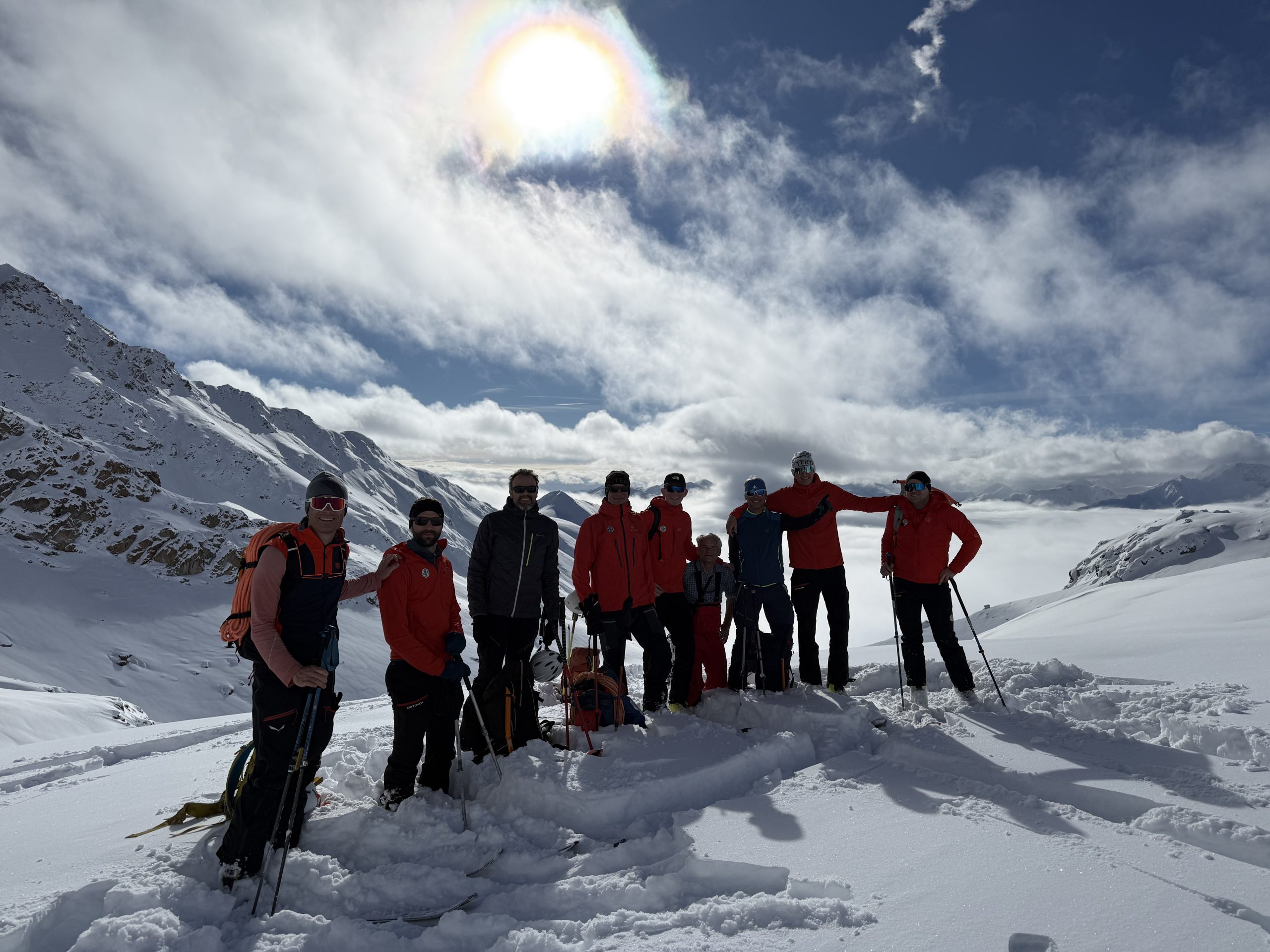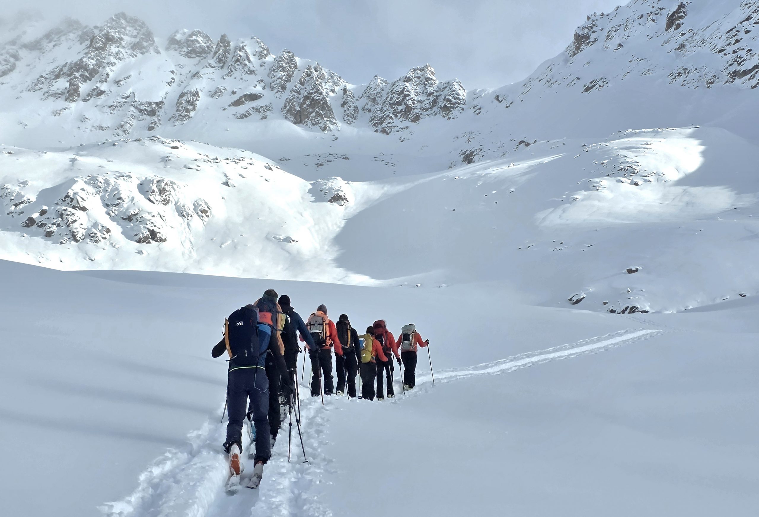 Am nächsten Tag sahen wir die Sonne und auch zum ersten Mal das tolle Bergpanorama. Nach einem gemütlichen Frühstück brachen wir Richtung Porta d’Es-cha auf. Der anhaltende Schneefall über Nacht hatte mindestens 40 cm Neuschnee gebracht. Die Lawinensituation war nicht außer Acht zu lassen, weshalb wir unseren Anstieg zur Porta über etwas lieblicheres Gelände anpassten. Vor dem steilen Anstieg zur Porta machten wir uns noch einmal einen gemeinsamen Überblick über diesen steilen Hang der sich vor uns aufbäumte und kamen alle zu dem Entschluss, dass dieser Anstieg heute leider nicht zu machen ist. Wir genossen noch ein wenig das tolle Panorama und richteten uns dann für den Abstieg her. Es wartete noch eine tolle Abfahrt mit Pulverschnee auf uns.