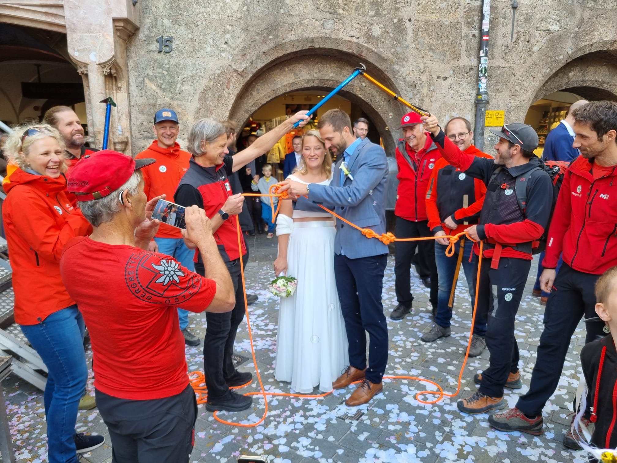 Anna hat im Innsbrucker Standesamt unter dem Goldenen Dachl ihrem Stephan das Ja-Wort gegeben. Natürlich durften die Kameradinnen und Kameraden der Ortsstelle nicht fehlen. Sie standen Spalier und stellten Stephan noch vor eine kleine Herausforderung. Er musste einen Spezialknoten in einem Kletterseil lösen, bevor er die ersten Schritte als Ehemann mit seiner Anna machen konnte.